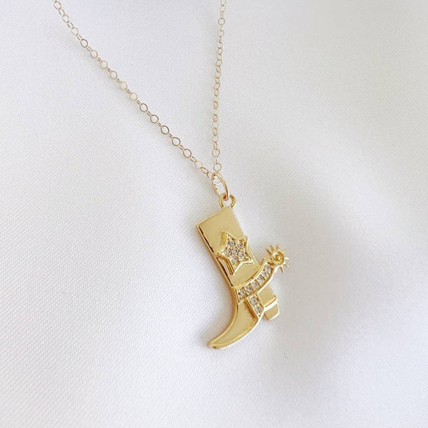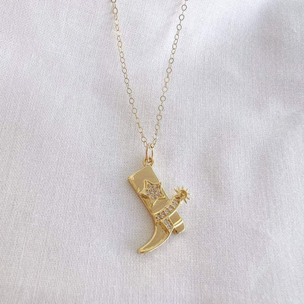 This gold-filled cowboy boot necklace is a must-have for any western fashion enthusiast. With a 14k gold filled dainty chain, this necklace is both durable and delicate, making it the perfect accessory for any occasion. Show off your love for cowboy boots with this stylish and elegant necklace.